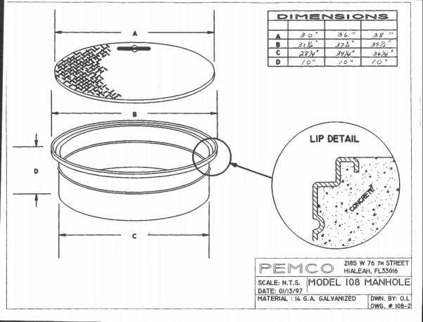 The Round Manhole features a 3/8″ diamond plate steel cover with rust resistant coating, a 4″ wide reinforcing channel welded to the underside of the cover, 14 gauge galvanized steel skirt and carries the H-20 load rating. The galvanized steel skirt body is rolled to form the manhole ring. The covers include an easy grip recessed handle. Optional PEMCO Model 106L liners are also available for all models of the round manhole.