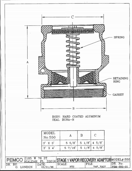 The Vapor Recovery Adapter is used for returning vapors to the transport tanker during UST filling. This poppeted adapter provides a vapor tight seal when not in use. The adapter features a hard coated aluminum body, Buna-N gasket, chrome plated stem, stainless steel spring and is rated at 10 PSI maximum working pressure. Manufactured in accordance with the industry standard, this adapter can be used with PEMCO or other brand vapor recovery caps.